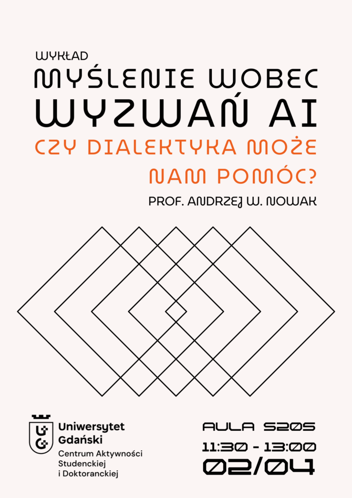 Wykład prof. UAM  Andrzeja W. Nowaka ramach serii „Wokół Krytyki Społecznej” pt.  „Myślenie wobec wyzwań AI. Czy dialektyka może nam pomóc?”. W wykładzie podjęte są zagadnienia, które hasłowo można ująć jako: dialektyka kontra algorytm oraz  Iljenkow, AI i krytyka automatyzacji…